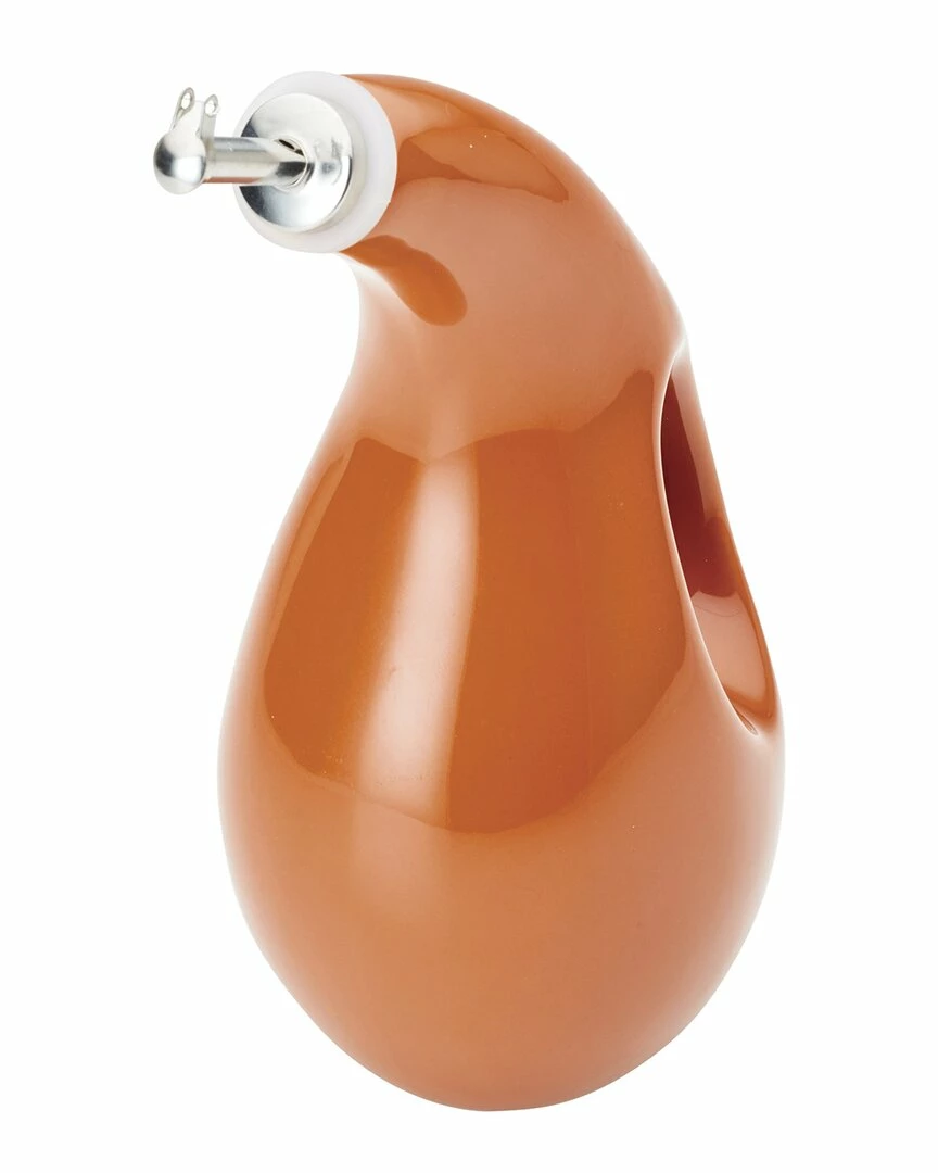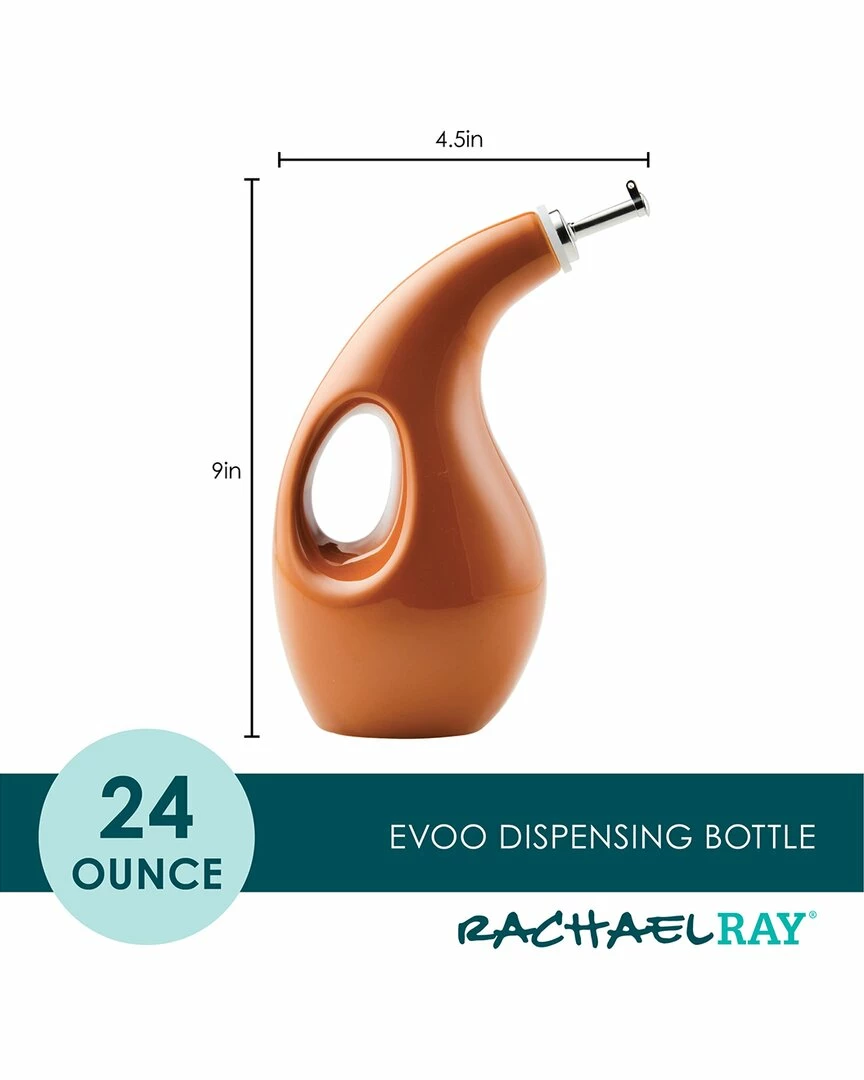 - Made from durable, easy-clean, kitchen friendly ceramic, this Rachael Ray EVOO bottle is ideal for dispensing oil and vinegar. Designed for control and balance, this olive oil and balsamic vinegar bottle has a built-in handle for an easy grip when pouring oils and dressings onto breads, salads, and more. Dishwasher safe for easy cleanup and boasting awesome color, this versatile dispenser partners great with Rachael Rays ceramic dipping cups, dinnerware and serveware for a stylish splash to any decor.