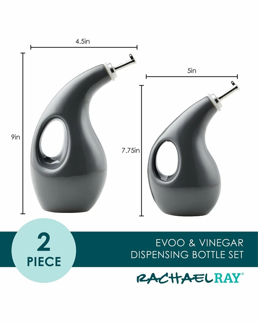 - Splash, drizzle and pour on the fun when creating delicious salads, appetizers and more at home with the Rachael Ray Ceramic EVOO and Vinegar Bottle Set. Dress a dinner party salad with a delicious balsamic vinaigrette with these vibrant cruets, or drizzle extra virgin olive oil – EVOO, as Rachel calls it – over her Apple Bacon Cheddar Crostini. The ceramic bottles are opaque to protect oils and vinegars from oxidation, and have handles integrated into the design to make them easy to grab and comfortable to hold. The overall shape is both timeless and trendy, and the pouring spouts are proportioned to help deliver the ideal pour. For added convenience, the oil and vinegar EVOO bottle set is also dishwasher safe. Great as a bold display right on the countertop or table, this fun EVOO and vinegar bottle set is the perfect complement to many other items in the Rachael Ray collections.