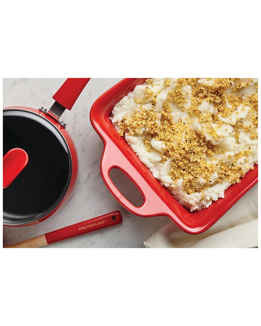 - Design details: Cozy up in the kitchen to the comfortable performance and style of the Rachael Ray 9-Inch by 13-Inch Stoneware Baker, inspired by Rachael’s time in Copenhagen and her love of hygge (hoo-gah): a look of coziness, enjoying the good things in life, a state of mind; Crafted of high-quality, durable stoneware and finished with a vibrant, stain-resistant glaze, this baker will have home cooks prepped to handle comfy oven-to-table recipes meal after meal. Whether to make a family-favorite casserole like Rachaels Stuffed Eggplant and Chicken Parm with Tomato-Basil Sauce or to bake a batch of indulgent fudgy brownies, this stoneware baker brings relaxation and comfort to every meal. Distinctive edges and wide handles offer a full, comfortable grasp making it easy to transfer a piping hot roasted chicken from kitchen to table, even with oven mitts. And the handy dish is conveniently safe for use in the freezer, microwave and dishwasher. Oven safe to 500F, this contemporary baker and roaster is great to mix and match with many other items in the Rachael Ray collections; When comfort foods, casseroles, lasagna and other yummy baked dishes are on the menu, turn to the Rachael Ray 9-Inch x 13-Inch Stoneware baker to set the mood for Copenhagen Cozy and then let the mealtime memories begin