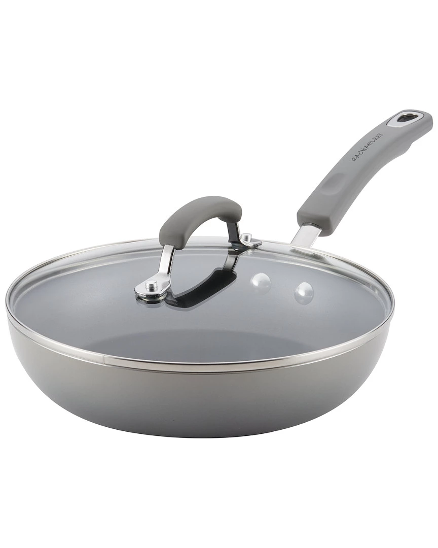 - Design details: One-Pan wonder meals are in easy everyday reach with the Rachael Ray Classic Brights Hard Enamel Nonstick 9.5-Inch Covered Deep Skillet. ; This handy pan features deeper walls compared to a standard skillet to easily manage multiple ingredients for one-pan meals like Rach’s Skillet-Roasted Chicken with Rosti Potatoes and Baby Veggies. Combining superior performance, fun contemporary color and durable materials, this skillet is ideal for Rachael’s Peppers ‘n’ Potatoes Beef Skillet Supper. The pan’s sturdy construction promotes even heating, helping to reduce hot spots that can burn foods, and the two-tone bold enamel exterior shows plenty of stylish kitchen personality. A durable nonstick interior provides superior food release and makes cleanup a breeze. Oven safe to 350 F, the skillet’s comfortable grippy handle is double riveted for extra strength, while a shatter-resistant tempered glass lid seals in heat and moisture even as you watch ingredients cook up. ; Discover a fun and stylish pan that goes deep on the stovetop with the bold and contemporary Rachael Ray Classic Brights Hard Enamel Nonstick 9.5-Inch Covered Deep Skillet
