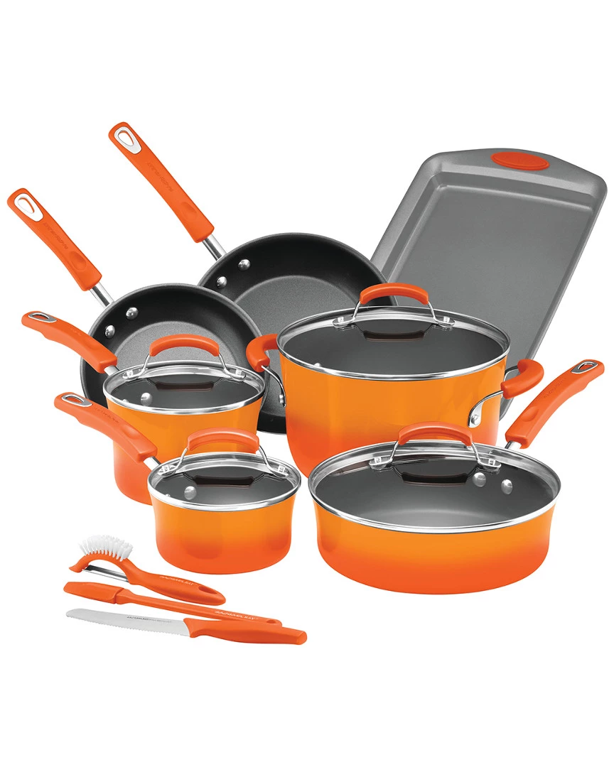 - Design details: Kick off your cooking in style, with the Rachael Ray Classic Brights Hard Enamel Nonstick 14-Piece Cookware Set that adds more of Rachaels flair to the kitchen with an extra boost from her clever bakeware and kitchen tools; From saucepans to skillets to a large stockpot for one of Rachael Rays delish stoups, kitchen tools and a baking sheet, this versatile cookware set makes it easy to whip up your favorite dishes. The cookware and bakeware features the quality design and construction expected from Rachael Ray, for fast, efficient cooking when you want and need it most. Long-lasting nonstick on the cookware interiors and bakeware interiors and exteriors makes food release and cleaning up easy. Sturdy colorful enamel cookware provide a pop of kitchen personality, and match the grippy silicone handles on the pots and pans and cookie sheet; Rachael Ray knows how to make cooking fun, easy and colorful, for more great food and good times. The covered pots and pans in her cookware set feature shatter-resistant glass lids to keep the heat and moisture inside. And the three cooking tools included a Lil’ Devil mini spatula, a Veg-A-Peel, and a serrated utility knife are smartly-designed so your cooking really cooks! The cookware is oven safe to 350F, while the cookie pan is oven safe to 450F, and the versatile set goes great with many other items from the full Rachael Ray collection; Start to finish, including easy cleanup, the Rachael Ray Classic Brights Hard Enamel Nonstick 14-Piece Cookware Set includes the right kitchenware ingredients to help make your ingredients and Rachs recipes even more delish