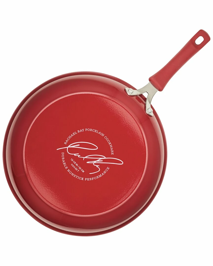 - Level up your kitchen with Cook + Create Nonstick Cookware from Rachael Ray. This roomy and super-functional nonstick 12.5-inch frying pan s is crafted from thicker gauge aluminum for a luxe and sturdy feel and reliable stovetop performance that heats up quickly and evenly. The on-trend, contemporary design features a tulip-shaped profile for bigger and wider cooking surfaces and optimum frypan performance with flair. Want even more convenience? The skillet also features nonstick on the inside rivets, for super-smooth stirring and easy-clean cooking surfaces that don’t get food build-up around the handle attachments. A new, triple layer nonstick provides the ultimate in scratch resistance and durability, and the frying pan is oven safe to 400F. For even more of what you want (and less of what you don’t), reach for Rachael Ray Cook + Create cookware and uplevel your mealtime moments with performance and flair.