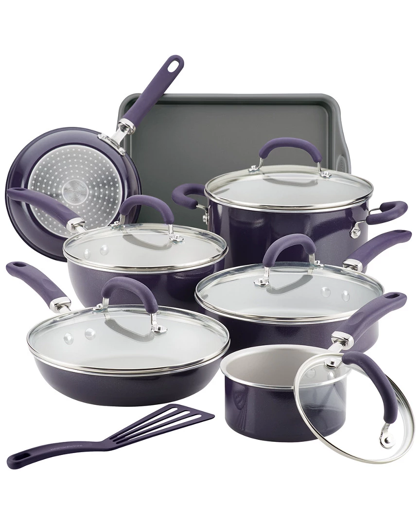 - Design details: Radiant and solution-oriented, the Rachael Ray Create Delicious 13-Piece Aluminum Nonstick Cookware Set brings high performance and easy convenience to home chefs eager for kitchen versatility with style; Featuring vibrant, shimmering color combined with value-driven functionality, this collection of essential pots and pans upgrades Rachael’s always-reliable performance with durable aluminum construction for ultra-even heating and browning. Even better, the cookware interiors feature enhanced PlatinumShield and trade; Technology nonstick reinforced to be 9 times harder than titanium for effortless food release of the stickiest recipes like Rach’s Spinach-Artichoke Cheesy Tortellini or her Sticky Orange Chicken with Herbs. Plus, all of the pots and pans – from the covered saucepans and 5-quart Dutch oven to the skillets and kitchen tools – are dishwasher safe for quick and easy cleanup; Colorful, double-riveted stainless steel and silicone handles provide comfort and control that’s oven safe to 400F, and shatter resistant glass lids lock in heat and flavor while allowing foods to be monitored while they cook. Flared cookware rims make for easy pouring, and an induction-suitable stainless steel base provides strength, durability, and versatility to use the cookware on any stovetop. Included in the 13-piece set, a 10-inch by 15-inch cookie pan is ready for chocolate chip cookies and chicken dippers alike, and the nylon turner and Veg-a-Peel tool will have you ready to prep and serve from the get-go; From dishwasher-safe convenience to the enhanced durability of PlatinumShield and trade; nonstick, reach for the easy brilliance of the Rachael Ray Create Delicious 13-Piece Aluminum Nonstick Cookware Set and get ready to get delish.