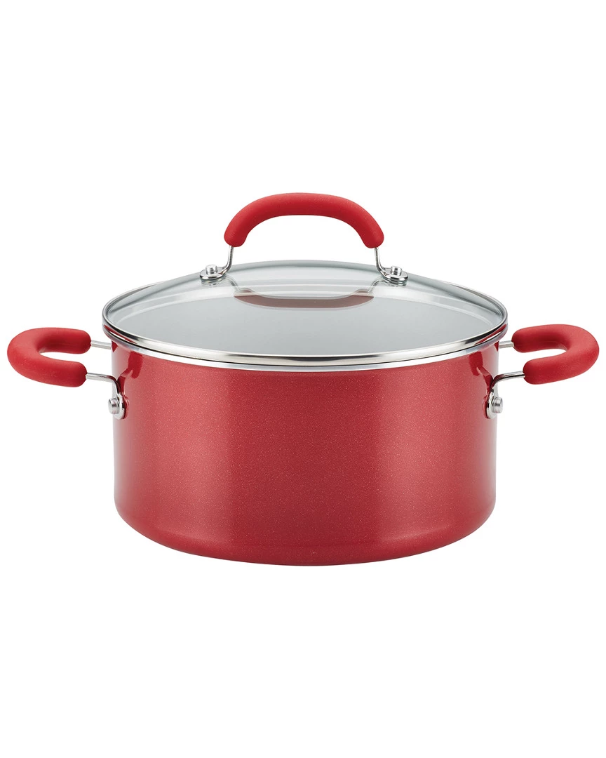 - Design details: Radiant and solution-oriented, the Rachael Ray Create Delicious Aluminum Nonstick 6-Quart Stockpot brings high-quality performance and everyday convenience to home chefs eager for kitchen versatility with style; Featuring vibrant, shimmering color combined with value-driven functionality, this roomy stockpot is perfect for soups, stews, stoups and one-pot meals like Rach’s Sausage and Shrimp. Durable aluminum construction provides ultra-even heating and features enhanced PlatinumShield and trade; Technology silver nonstick reinforced to be 9 times harder than titanium for effortless food release. Plus, the stockpot is dishwasher safe for quick and easy cleanup; Want more? Colorful, double-riveted stainless steel and silicone handles provide comfort and control that’s oven safe to 400F, and a shatter resistant glass lid locks in heat and flavor while allowing foods to be monitored while they cook. Flared cookware rims make for easy pouring, and an induction-suitable stainless steel base provides strength, durability, and versatility to use the cookware on any stovetop; From dishwasher-safe convenience to the enhanced durability of PlatinumShield and trade; nonstick, reach for the big brilliance of the Rachael Ray Create Delicious Aluminum Nonstick 6-Quart Stockpot and get ready to get delish.