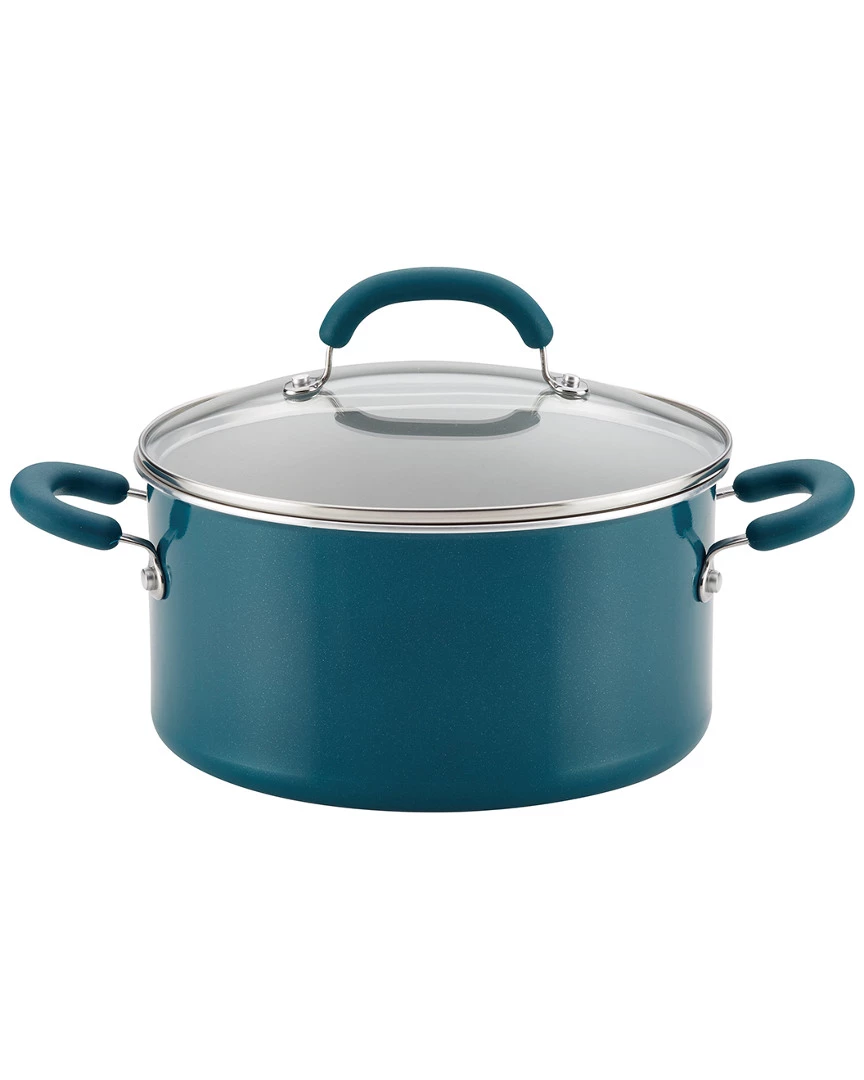 - Design details: Radiant and solution-oriented, the Rachael Ray Create Delicious Aluminum Nonstick 6-Quart Stockpot brings high-quality performance and everyday convenience to home chefs eager for kitchen versatility with style; Featuring vibrant, shimmering color combined with value-driven functionality, this roomy stockpot is perfect for soups, stews, stoups and one-pot meals like Rach’s Sausage and Shrimp. Durable aluminum construction provides ultra-even heating and features enhanced PlatinumShield and trade; Technology silver nonstick reinforced to be 9 times harder than titanium for effortless food release. Plus, the stockpot is dishwasher safe for quick and easy cleanup; Want more? Colorful, double-riveted stainless steel and silicone handles provide comfort and control that’s oven safe to 400F, and a shatter resistant glass lid locks in heat and flavor while allowing foods to be monitored while they cook. Flared cookware rims make for easy pouring, and an induction-suitable stainless steel base provides strength, durability, and versatility to use the cookware on any stovetop; From dishwasher-safe convenience to the enhanced durability of PlatinumShield and trade; nonstick, reach for the big brilliance of the Rachael Ray Create Delicious Aluminum Nonstick 6-Quart Stockpot and get ready to get delish.
