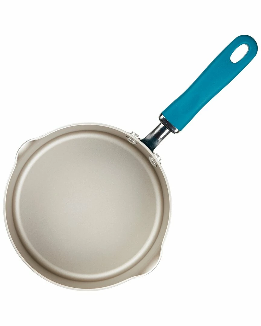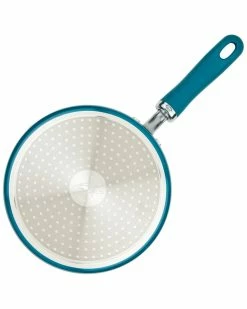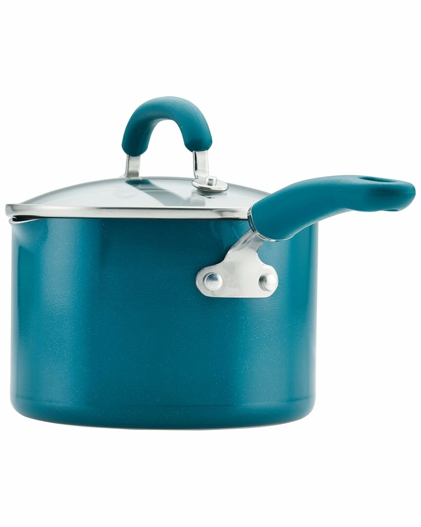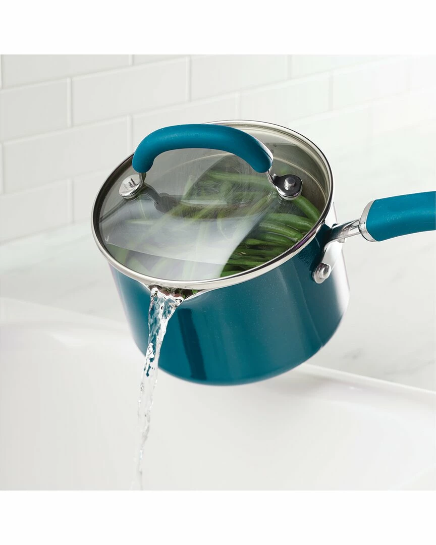 - Radiant and solution-oriented, the Rachael Ray Create Delicious Aluminum Nonstick Straining Saucepan brings high performance and easy convenience to home chefs eager for kitchen versatility with style. The always-reliable performance of Rachael Ray cookware is met with durable aluminum construction for ultra-even heating and browning. The pans interior features enhanced PlatinumShield Technology silver nonstick reinforced to be 9x harder than titanium for effortless food release of the stickiest recipes like Rach’s Spinach-Artichoke Cheesy Tortellini or her Sticky Orange Chicken with Herbs. Tempered glass lid has built-in strainer to easily drain liquids from pasta and other foods without the need of a colander. Colorful, dual-riveted stainless steel and silicone handles provide comfort and control while cooking and serving. Dishwasher safe for easy cleanup. Oven safe to 400F.