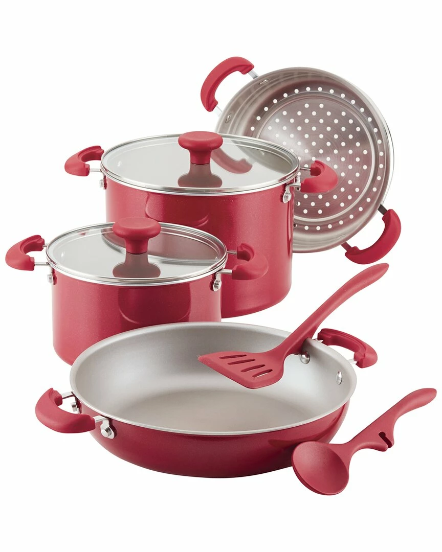 - RED SHIMMER SET INCLUDES: 4-quart saucepot with lid, 8-quart stockpot with lid, 12.5-inch everyday pan, 12-inch lazy solid spoon, 12-inch lazy slotted turner, 8-quart stainless steel steamer insert