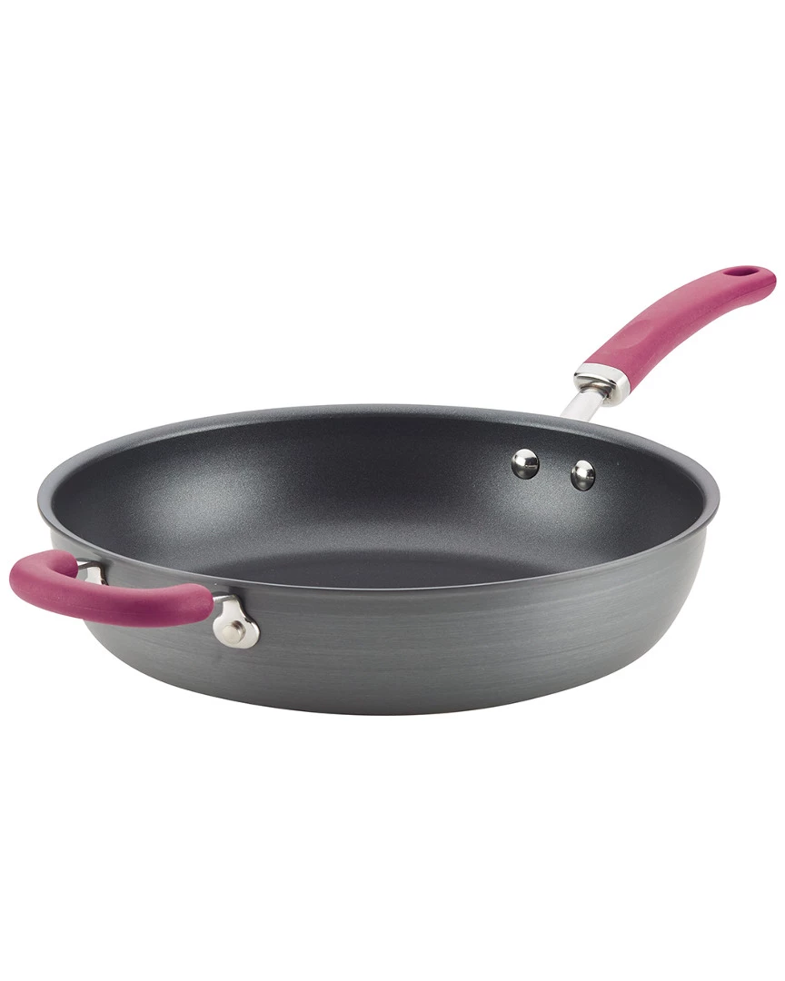 - Design details: Durable and solution-oriented, the Rachael Ray Create Delicious 12.5-Inch Hard-Anodized Nonstick Deep Skillet brings high performance and cooking convenience to home chefs eager for kitchen versatility with long-lasting dependability; Constructed from extra-durable hard-anodized aluminum, this deep skillet features higher pan walls and upgrades Rachaels always-reliable performance with enhanced PlatinumShield Technology nonstick reinforced to be 9 times harder than titanium for effortless food release of Rach’s Crispy Skin Chicken Breasts with Escarole and White Beans or her recipe for BBQ Skillet Pie with Corn Muffin Topper; Colorful, double-riveted stainless steel and silicone handles provide comfort and control thats oven safe to 400F, a flared rim makes for easy pouring, and an induction-suitable stainless steel base provides strength, durability, and versatility to use the skillet on any stovetop; From enhanced durability to superior PlatinumShield nonstick, reach for the long-lasting convenience of the Rachael Ray Create Delicious 12.5-Inch Hard-Anodized Nonstick Deep Skillet and get ready to get delish.