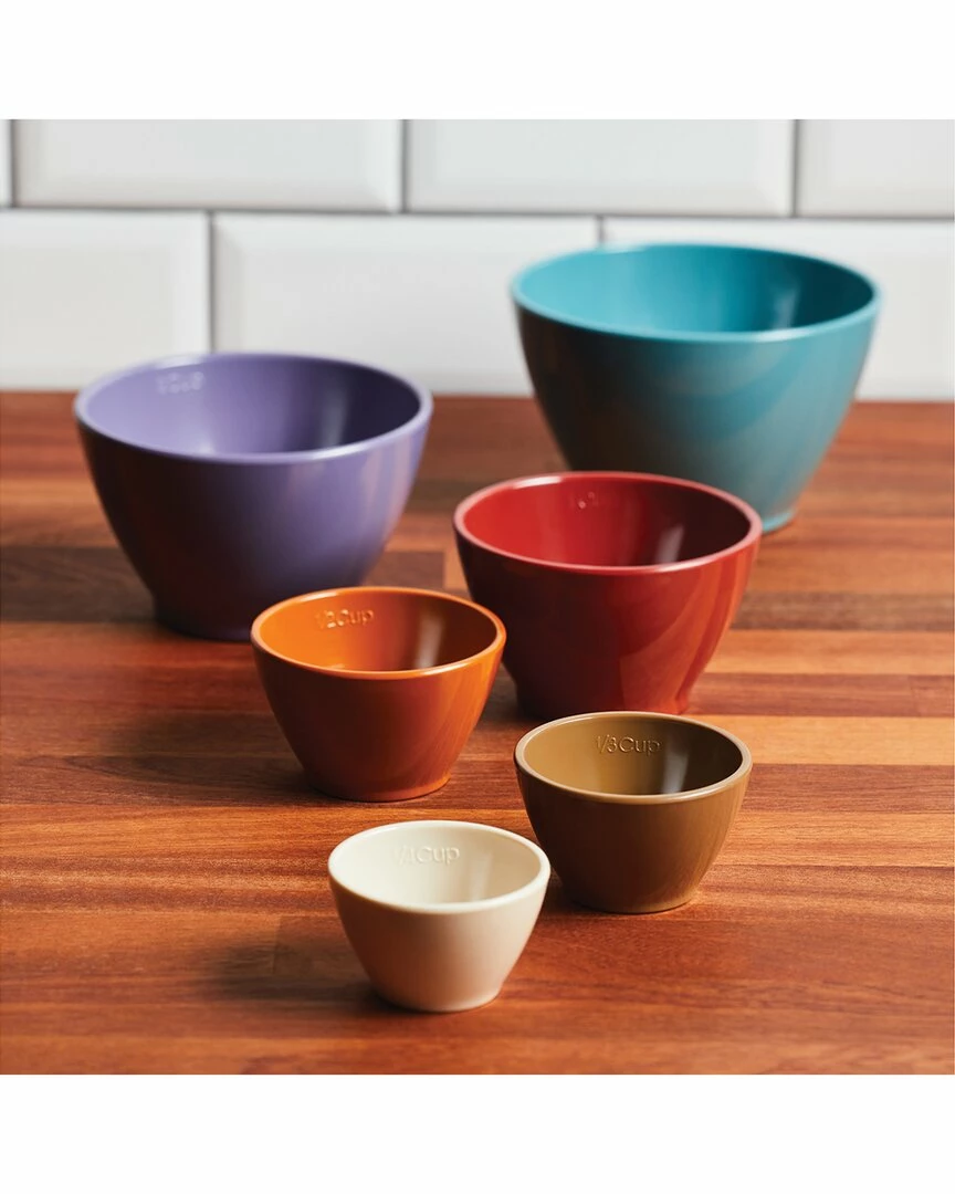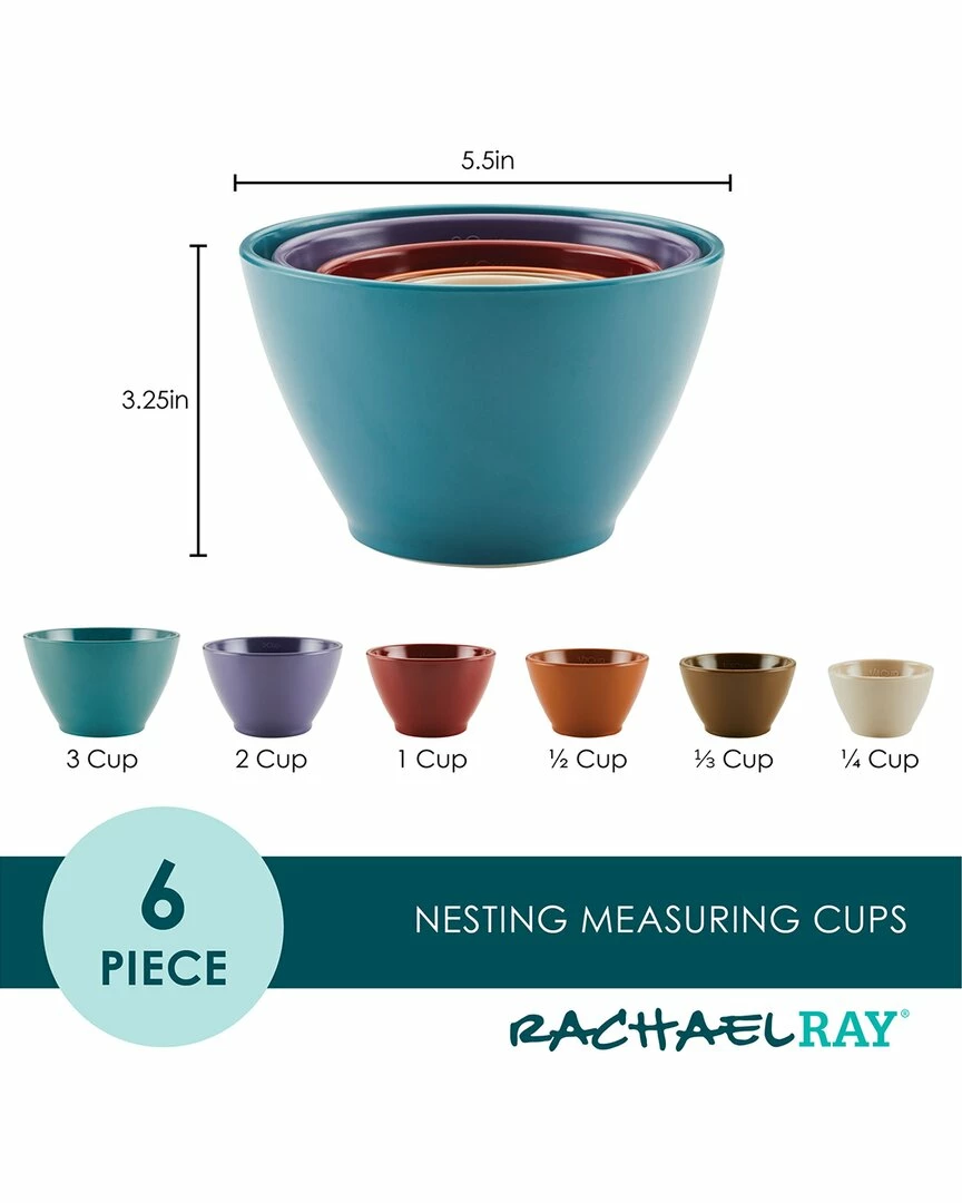 - Measure and prep in style with the Rachael Ray Cucina Nesting Measuring Cups Set. This six piece set of colorful measuring cups is crafted from durable melamine for lasting performance whether scooping up dry ingredients or adding liquids to savory meals. For easy storage convenience, these standard-sized, BPA-free cups stack neatly inside one another to save space in the kitchen drawer and are dishwasher safe for easy cleanup.