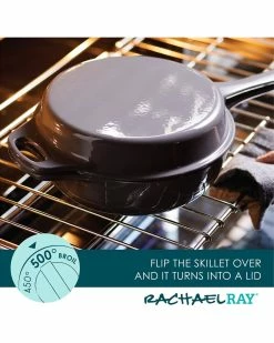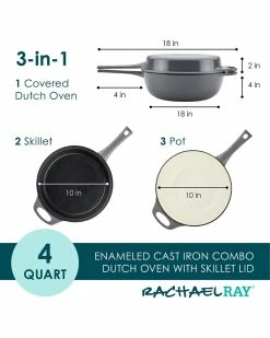 - Move easily from searing and sizzling to one-pot slow-cooking with the Rachael Ray Enameled Cast Iron 3-in-1 Dutch Oven, Skillet, and Saute Pan Combo. This multi-use meal maker combines a traditional cast iron cooking pot with a 10-inch cast iron skillet that can also be used as a lid on the pot to create a fully functional Dutch oven. Durable cast iron delivers steady, long-lasting heat that’s perfect for searing ground beef and bacon to simmer into a delicious batch of Rachael’s Serious Three-Meat Chili. The superior enamel surface inside and out means easy cleaning with no pre-seasoning necessary, and has been engineered to prevent enamel from chipping. Suitable for all stovetops including induction, this cast iron cooking combo is perfect for meals that start on the stove and finish in the oven, where the cookware is heat safe to 500F. For oven-to-table style and superior performance for your next one-pot (or double-pot) masterpiece, reach for the Rachael Ray Enameled Cast Iron 3-in-1 Dutch Oven, Skillet, and Saute Pan Combo and get cooking.