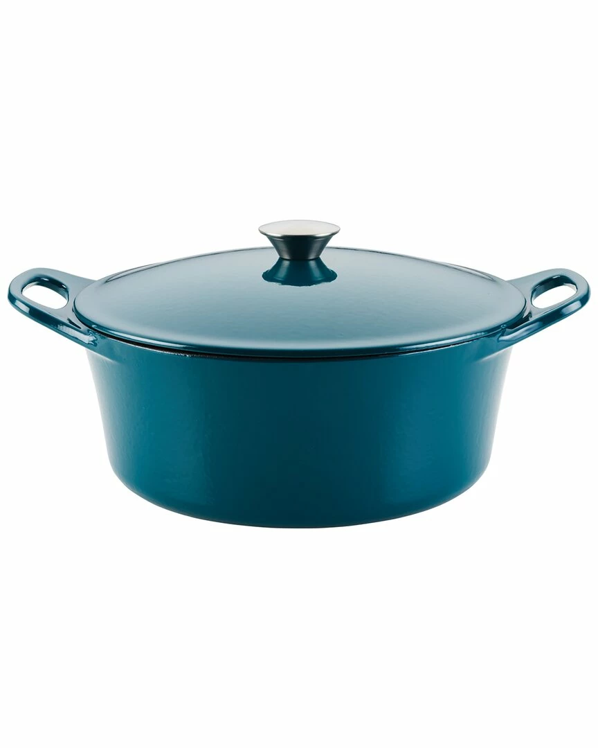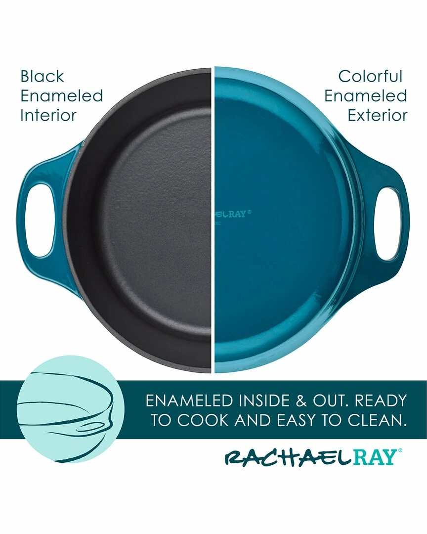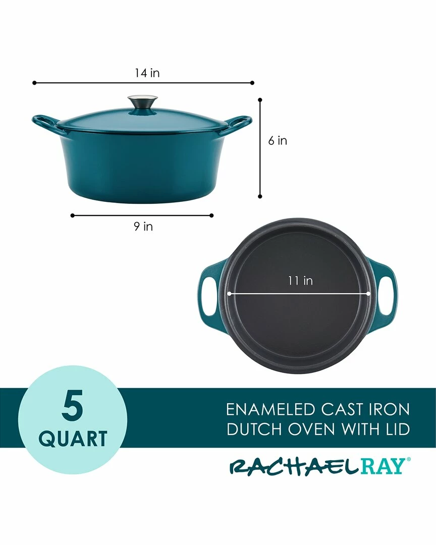 - Go for deep, delicious flavors, incredible sears, and one-pot braises with this 5-quart Rachael Ray Enameled Cast Iron Dutch Oven Casserole Pot. Durable cast iron delivers steady, long-lasting heat for stove-to-oven family favorites, and can be used for baking, too! The superior enamel surface inside and out means easy cleaning with no pre-seasoning necessary, and is engineered to prevent enamel from chipping. Suitable for all stovetops including induction, this cast iron cooking pot is perfect for meals that start on the stove and finish in the oven, where the Dutch oven is heat safe to 500F. For oven-to-table style and superior performance for your next one-pot masterpiece, reach for the Rachael Ray Enameled Cast Iron Dutch Oven Casserole Pot and get cooking.