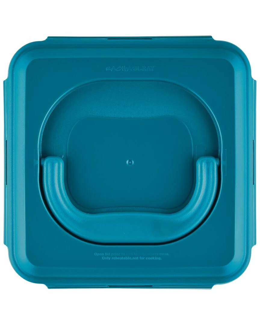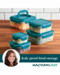 - Prep, store, and serve with this versatile set of leak-proof, nestable food storage containers from Rachael Ray. From freezing batches of marinara or popping prepped veggies in the fridge for easy weeknight dinners, these convenient leak-proof containers are perfect for anywhere your ingredients need to stay fresh and organized. The lightweight, durable design makes them great for picnics and parties (large container even features a flip-up handle!), and the containers conveniently stack or nest together when not in use for fast, smart storage that won’t clutter up the cabinet. Leak-proof, 4-hinge locking lids feature an enhanced silicone seal that’s airtight to keep foods fresh longer and prevent accidental spills and drips. Plus, you can heat and reheat meals and leftovers in these made-to-last containers that are microwave safe for convenience (lids should not be locked during microwave use) and dishwasher safe for easy cleanup. Keep your food prep and storage smart, simple, and stylish and save more cabinet and pantry space with the 10-piece Rachael Ray Leak-Proof Nestable Square Food Storage Container Set.