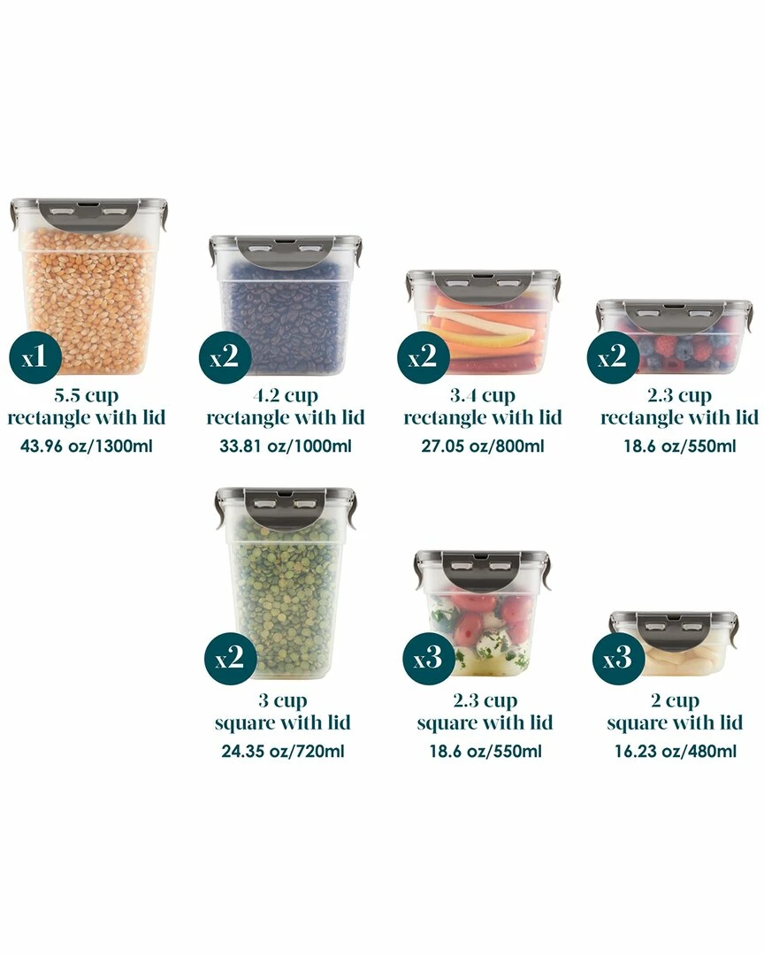 - container set includes: three 240ml / 1-cup containers with lids, three 480ml / 2-cup containers with lids, two 720ml / 3-cup containers with lids, two 550ml / 2.3-cup containers with lids, two 800ml / 3.4-cup containers with lids, two 1000ml / 4.2-cup containers with lids, 1300ml / 5.5-cup container with lid