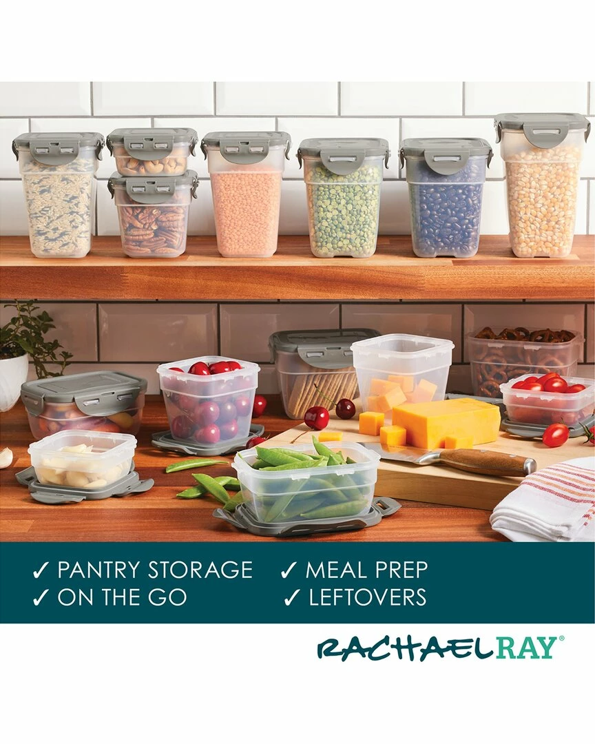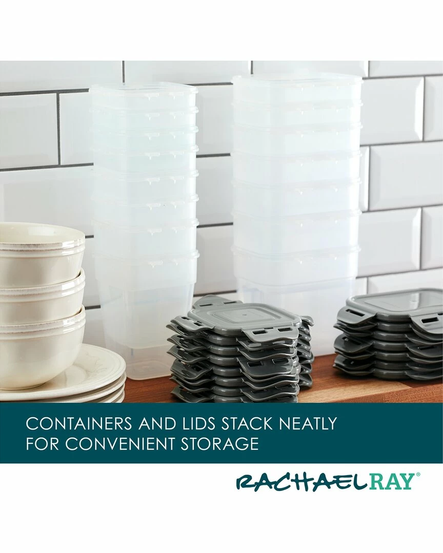 - Prep, store, and serve with this huge set of leak-proof food storage containers from Rachael Ray. From freezing batches of marinara or popping prepped veggies in the fridge for easy weeknight dinners, these convenient leak-proof containers are perfect for anywhere your ingredients need to stay fresh and organized. The lightweight, durable design makes them great for picnics and parties, and the containers conveniently stack and same-shape items nest together when not in use for fast, smart storage that won’t clutter up the cabinet. Leak-proof, 4-hinge locking lids feature an enhanced silicone seal that’s airtight to keep foods fresh longer and prevent accidental spills and drips. Plus, you can heat and reheat meals and leftovers in these made-to-last containers that are microwave safe for convenience (lids should not be locked during microwave use) and dishwasher safe for easy cleanup. Keep your food prep and storage smart, simple, and stylish and save more cabinet and pantry space with the 30-piece Rachael Ray Leak-Proof Stacking Food Storage Container Set.