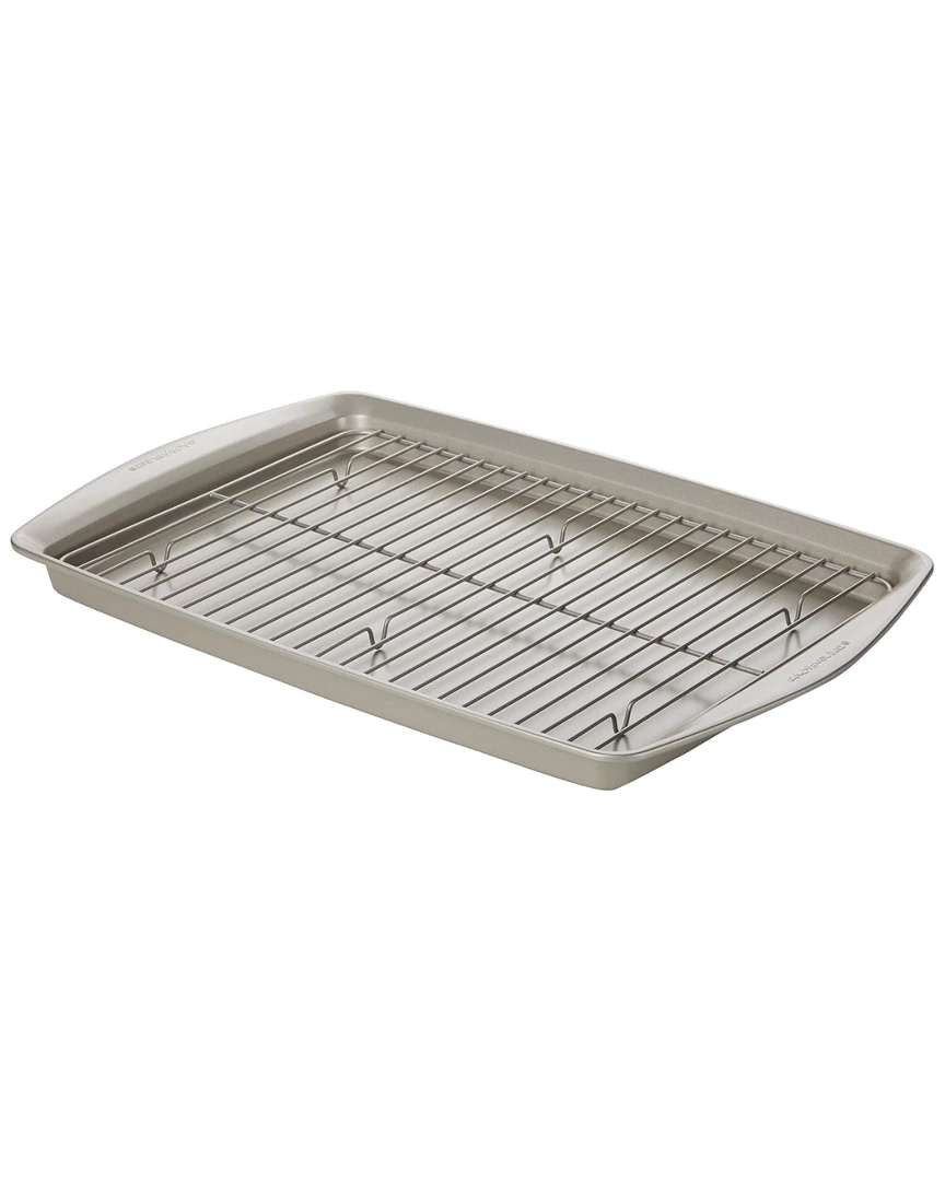 - Design details: Go family size with the hot wings and french fries with the Rachael Ray Silver Nonstick Bakeware Jumbo Cookie Pan and Roasting Rack Set. Made from heavy gauge steel, this big 13-Inch by 19-Inch cookie pan resists warping and feature long-lasting nonstick that provides excellent food and baked good release with easy cleanup. The companion rack insert is perfect for all-over browning and roasting, and also serves conveniently as a countertop cooling rack for cookies and cookie bars. Rolled-rims provide a confident grip for easy handling, even with bulky oven mitts on, and the pan and rack are oven safe to 450F. Great for sheet pan meals and big batches of baked goods, this versatile pan is the perfect complement to many other pieces in Rachael’s bakeware and cookware collections that always spell fun in the kitchen. Turn up the heat and bake some excitement with the Rachael Ray Silver Nonstick Bakeware Jumbo Cookie Pan and Roasting Rack Set.