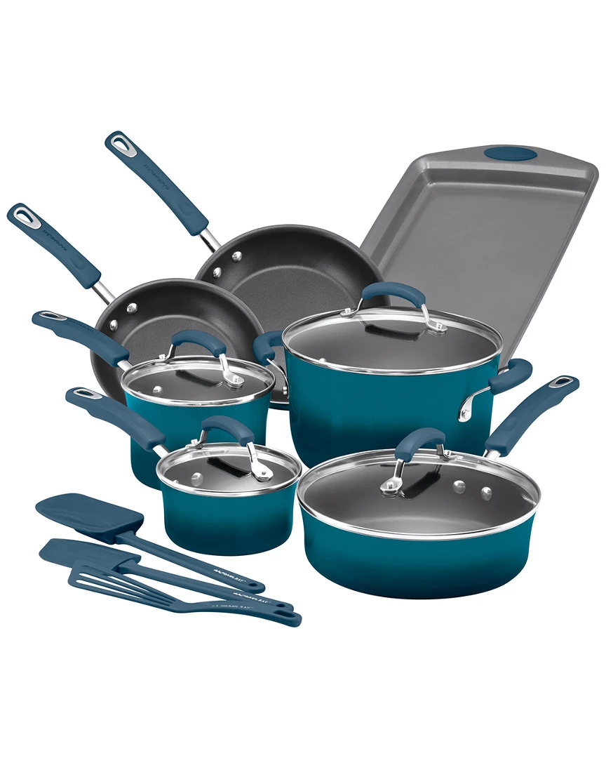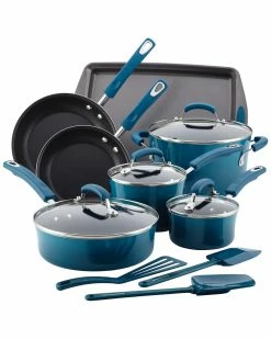 - Design details: Kick off your cooking in style, with the Rachael Ray(r) Classic Brights Hard Enamel Nonstick 14-Piece Cookware Set that adds more of Rachaels flair to the kitchen with an extra boost from her clever bakeware and kitchen tools. From saucepans to skillets to a large stockpot for one of Rachael Rays delish stoups, kitchen tools and a baking sheet, this versatile cookware set makes it easy to whip up your favorite dishes. The cookware and bakeware features the quality design and construction expected from Rachael Ray, for fast, efficient cooking when you want and need it most. Long-lasting nonstick on the cookware interiors and bakeware interiors and exteriors makes food release and cleaning up easy. Sturdy colorful enamel cookware provide a pop of kitchen personality, and match the grippy silicone handles on the pots and pans and cookie sheet. Rachael Ray knows how to make cooking fun, easy and colorful, for more great food and good times. The covered pots and pans in her cookware set feature shatter-resistant glass lids to keep the heat and moisture inside. And the three cooking tools included a spatula, a spoonula, and a long-bladed turner are smartly-designed so your cooking really cooks! The cookware is oven safe to 350F, while the cake pans are oven safe to 450F, and the versatile set goes great with many other items from the full Rachael Ray collection. Start to finish, including easy cleanup, the Rachael Ray Classic Brights Hard Enamel Nonstick 14-Piece Cookware Se t includes the right kitchenware ingredients to help make your ingredients and Rachs recipes even more delish.