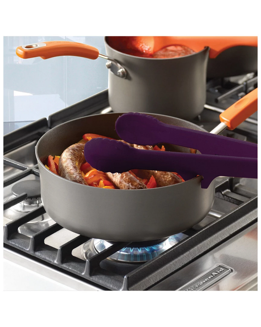 - Design details: Ready to work and right within reach every time, the Rachael Ray Tools & Gadgets Lazy Tongs are the recipe for cooking convenience. Boasting innovative design and bold color, this silicone tool is also contoured for extra comfort and hand grip. With the clever notches in these practical tongs, easily clip them on cookware sides to keep them at hand, and help keep drips inside pots and pans, not on countertops. These innovative tongs enable easier cooking, from turning chicken for a stir-fry, tossing Rachaels Chili-Garlic Roasted Broccoli, grabbing Warm Biscuits with Honey Butter from the bread basket and serving her Polenta Fries from the pan. With this durable tool, the possibilities are endless. Conveniently, the tongs are ideal for use with all cookware, including nonstick. Heat safe to 500F and dishwasher safe for convenience, these tongs are a great complement to many other exciting items in the Rachael Ray collection; Let the Rachael Ray Tools & Gadgets Lazy Tongs do all the work in the kitchen, and always know right where they sit